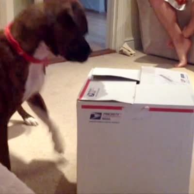 A boxer dog stairs at a cardboard box indoors and jumps around it until an angry cat bursts out of the box and hisses at the dog.
