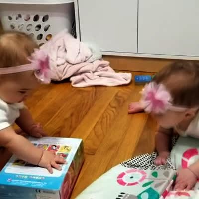 Twin baby girls in a bedroom fight over a box. One of the girls grabs the other girl's hair bow and snaps it back in her face and the man with the camera laughs.
