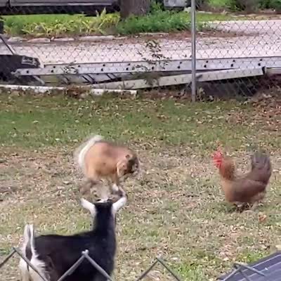 A teen girl picks a fight with a rooster in a backyard. Then the rooster chases the girl. The girl runs and falls over a trampoline. Then she gets up and continues to antagonize the rooster.