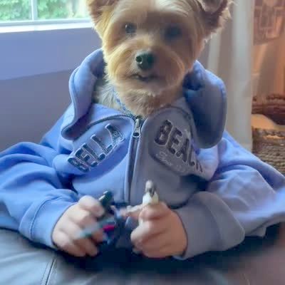 A Yorkshire Terrier dog with human hands plays with Star Wars figurines in a living room and makes lightsaber noises.