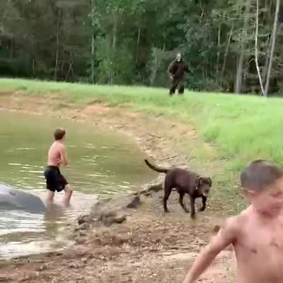 A young boy screams in a park and runs towards his mom as he says "it's Bigfoot I swear". His brother joins him, then they realize it's their father in a costume.