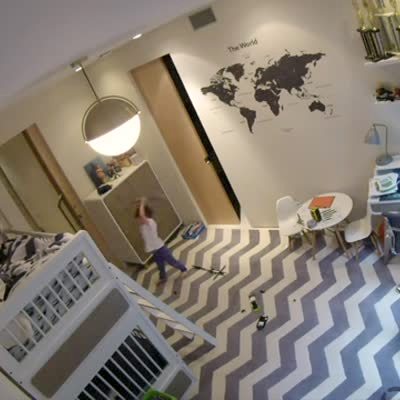 A young boy on a top bunk and a tot boy on the floor play fight in a bedroom, and the boy on the bed breaks the lamp. Security footage.