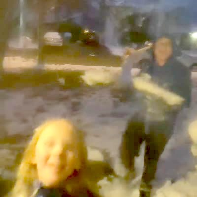 Two deer stand on their back legs and have a slap fight in the middle of a field, as shot through the window of a parked car.