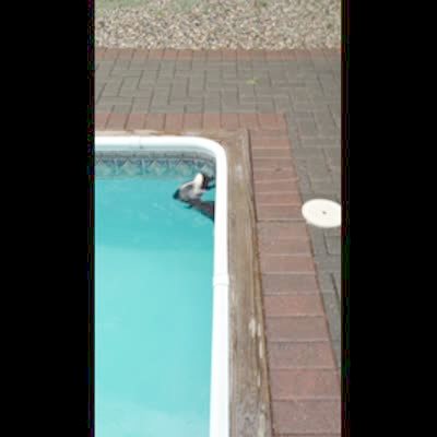 A skunk swims in a pool outdoors, goes into the skimmer, and pops out of the filter.