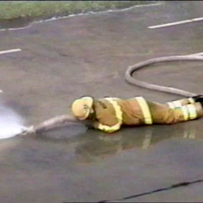 A man's meat smoker and house are on fire. He gets most of it out with a hose.