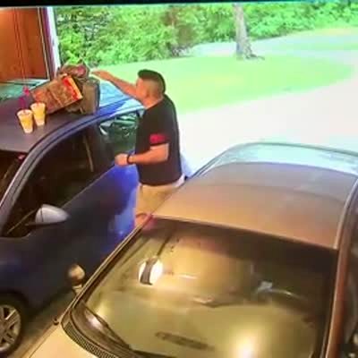 A series of clips where a large bird sits on the hood of a car and won't get off while a man drives it. In the first clip, the bird is on the hood while the man goes through a fast food restaurant drive through. The next two clips are while the man drives on the road.