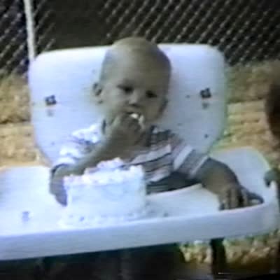 First birthday; Cake into face; b-day (Outdoors, in high chair)