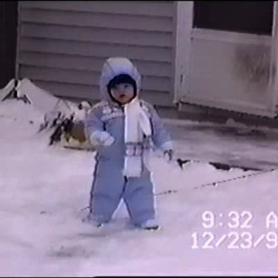 Winter tot baby in snow for first time. Dog trips up tot with leash. Tot falls (with recovery).