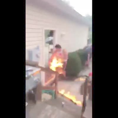 A man lights a pile of leaves drenched in gasoline on fire and it explodes, then he does a backflip in a yard. Security camera footage.