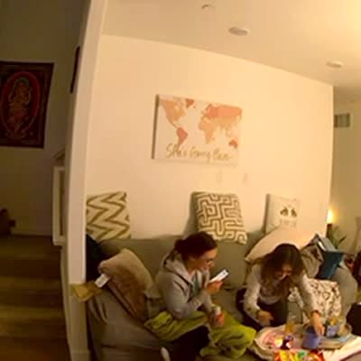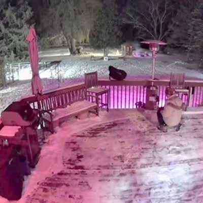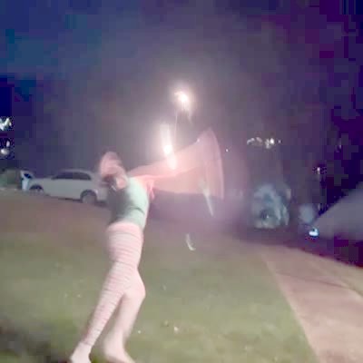 A woman screams and runs out of a front door with a garbage basket in flames. Eventually her husband comes outside with a toothbrush still in his mouth, as she tries to get the fire out in the driveway followed by her teen daughter and son. Security footage.