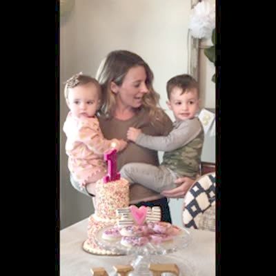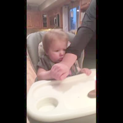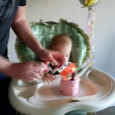 A woman yells No when her young daughter reaches for the lit candle on her birthday cookie as she sits in a high chair.