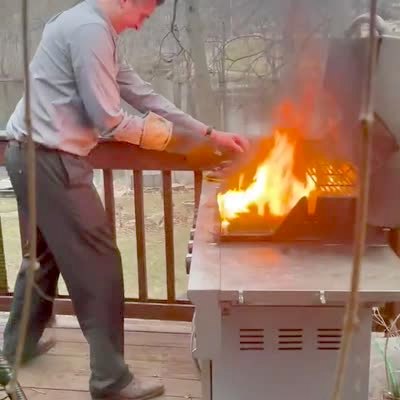 A man cooks hamburgers on a backyard grill with a large fire on it, and a young kid laughs off-camera and asks him what he did.