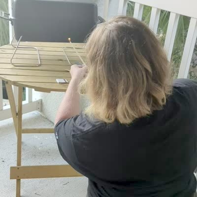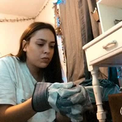 A teen girl solders over a blanket then catches it in flames and yells in the bedroom.