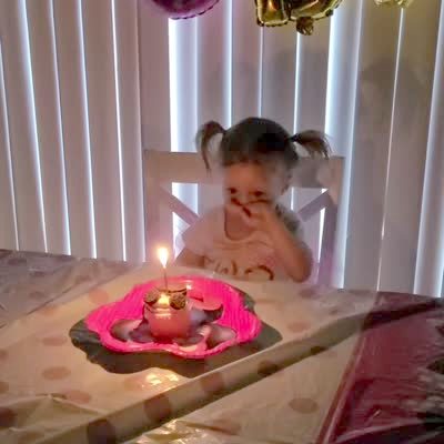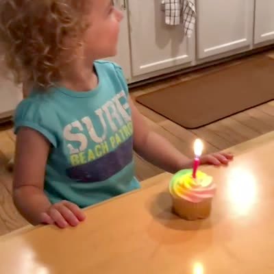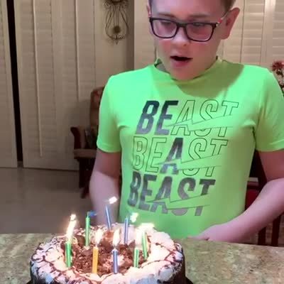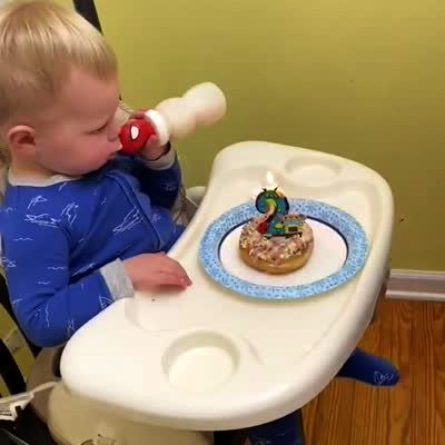 A family sings "Happy Birthday" to a young boy in the kitchen and his younger brother blows on his candles before he does. But the younger brother does not blow hard enough, so it takes a while to do it. The camera turns to reveal the younger brother.