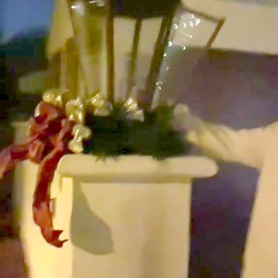 A woman pours her drink onto a candle and it flares up dramatically, catching on fire. Security footage.