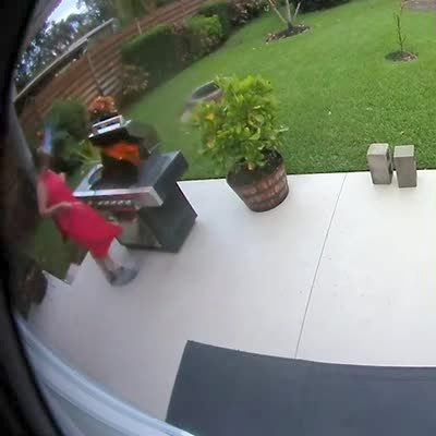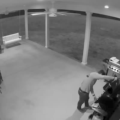 A barbecue catches on fire and a man runs away from it in a yard. Security footage.
