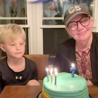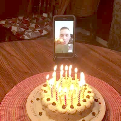 A woman tells a young man to blow out his birthday candles while he is on a FaceTime call. Then she blows on the candles at the same time to blow them out.