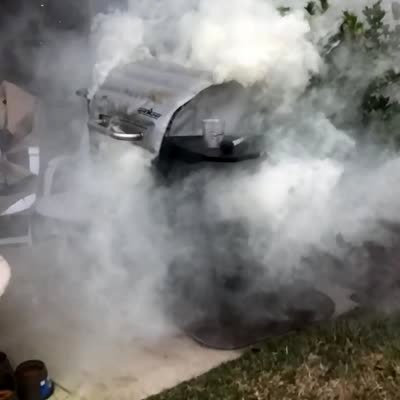 A woman walks onto a yard and opens a barbecue grill, then flames rise up out of it, and her hair smokes. Security footage.