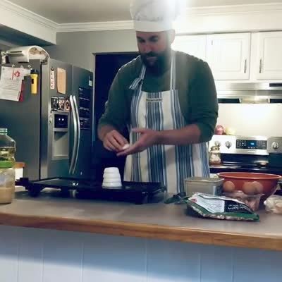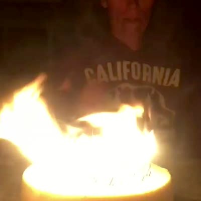 A man uses an air horn to blow out his birthday candles in the kitchen, and it turns into a flamethrower.