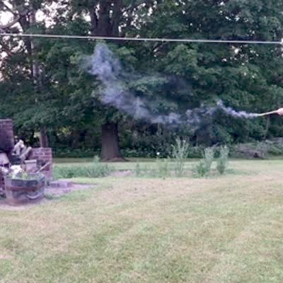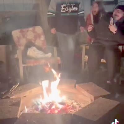 A man yells the word "magic" after he lights a brick fireplace in the backyard with a roman candle firework.