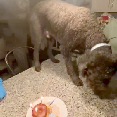A family sings "Happy Birthday" to their golden retriever. at the end of the song the dog barks once and blows out the candle.