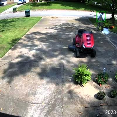 A man pours gas from a container onto a firepit and the cannister catches on fire and he throws it into the front-yard and gas spills on the lawn and catches fire and he walks over and kicks it to the driveway and slowly walks off-camera. Security footage.
