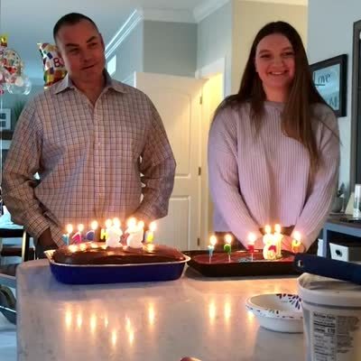A family sings happy birthday to a teen girl and man, and the girl struggles to blow her candles out but then the man claps his out.