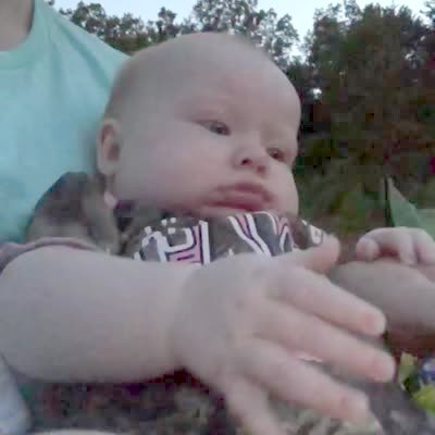 A woman has a baby on her lap outside. The baby cries when she sees fireworks on the fourth of July.