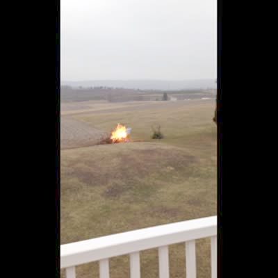 A barbecue explodes in the yard when a man and a woman try to smoke a turkey. Slow-motion.