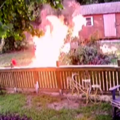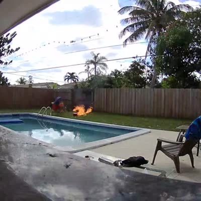A man sets something in his backyard on fire but the whole gas can catches on fire too. He throws it into the pool but it just sets the pool on fire. Security Footage.