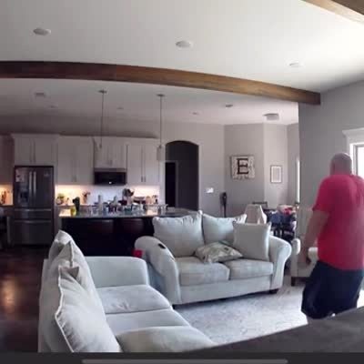 A fireplace explodes behind a man in a living room, and he jumps and says "oh gosh." Security footage.