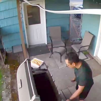 A man opens a barbecue grill in a yard, then yells and jumps back when fire explodes out of it. Security footage.