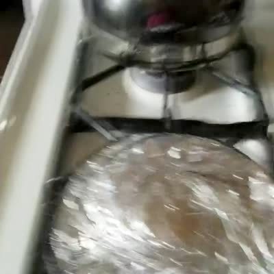 A woman makes popcorn on a stovetop in a kitchen and talks about how the popcorn was a gift from a friend, then she shows that her Shih Tzu dog watches her. Then she screams and says that it pops out of the pan, and she shows popcorn on fire on top of the stovetop.