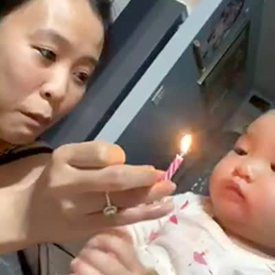 A group of people sing "Happy Birthday" to a baby girl, then she extinguishes the flame with her hands and cries in the dining room.