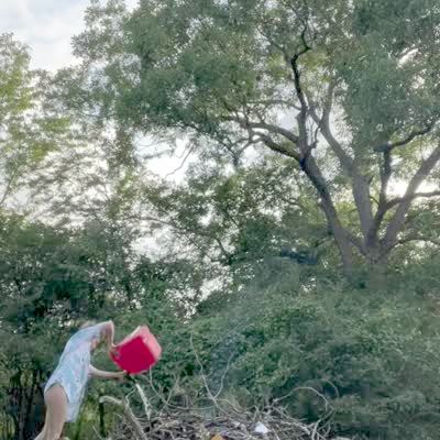 A teen girl pours gasoline all over tree branches outside, then she lights it on fire, but the fire takes a second to spread, and she jumps back when she gets too close to it. Dangerous.