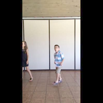 A young girl, young boy and man dance to "Turn Down For What." The man attempts to kick over the boy's head and he ends up hitting him with the back of his knee instead.