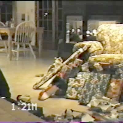 A woman in her living room plays darts. When she pulls on the chain to turn off the ceiling fan, the whole fan falls and breaks. Security Footage.