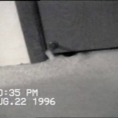 A man tries to flick a cicada off a porch wall, then it flies away and he falls backwards into a front yard and spills his drink. Security camera footage.