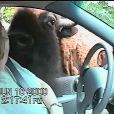 Woman at drive through zoo feeds a buffalo. It flicks its tongue with its head in the car. (1619)
