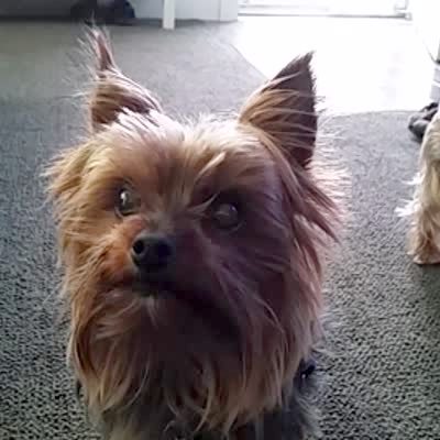 A.A. Pet Tricks. Man flicks cereal off the table toward a dog. The dog catches every piece. From several different angles.
