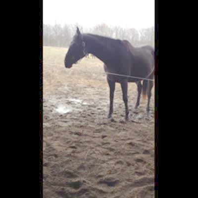 A black horse flicks its lips across a wire fence, making a noise outdoors.