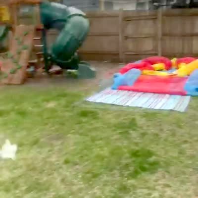 A man stands next to a bush in a yard and another person in a truck off-screen drives a truck with a rope attached the bush. The rope pulls on the bush then snaps and flies off and hits the man.