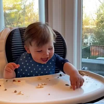A baby boy flicks pieces of cereal on his high chair food tray, then one of the pieces lands on his tongue and he eats it.