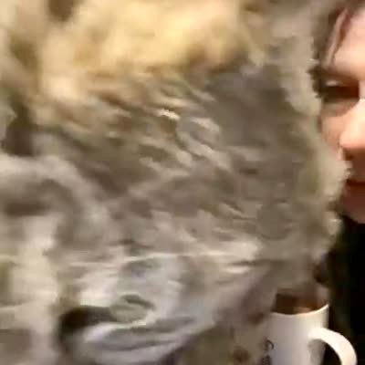 A cat walks on the table in front of a woman and her coffee. The cat then steps in the coffee, and then shakes her paw off and flings coffee onto the camera.