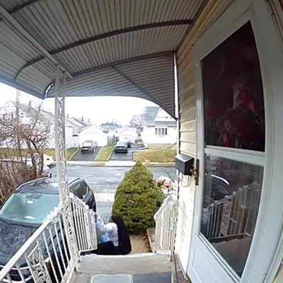 A woman slips and slides all the way down her front porch steps before she gets into her vehicle. Security footage.