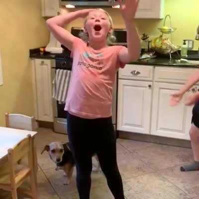 A young girl tries the whipped cream challenge but it flies over her head and lands on a dog's butt.