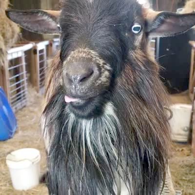 Goat stares at a dog & suddenly gets excited. Goat starts flicking its tongue & making weird noises. Odd.
