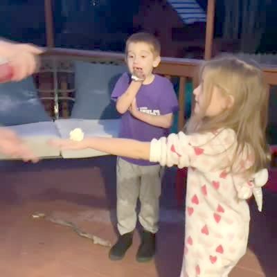 A woman explains the Whipped Cream Challenge to a young boy and girl, and the boy flings his whipped cream onto the camera lens.