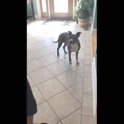 A man asks a dog if he wants to take a bath and the dog runs up a flight of stairs and jumps into a bathtub.