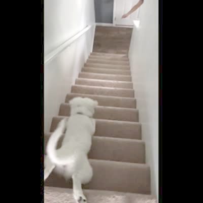 A woman yells "go" and starts to race her Labrador retriever and terrier down a flight of stairs but she trips and falls, breaking the railing off of the wall.